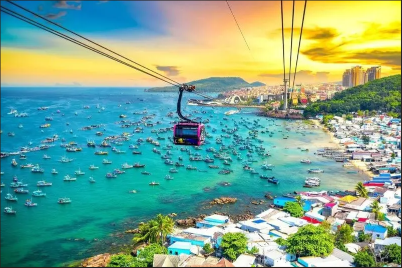 Cáp treo Hòn Thơm: Cáp treo 3 dây vượt biển dài nhất thế giới. Trải nghiệm ngắm toàn cảnh Vịnh An Thới và các hòn đảo tuyệt đẹp từ trên cao.