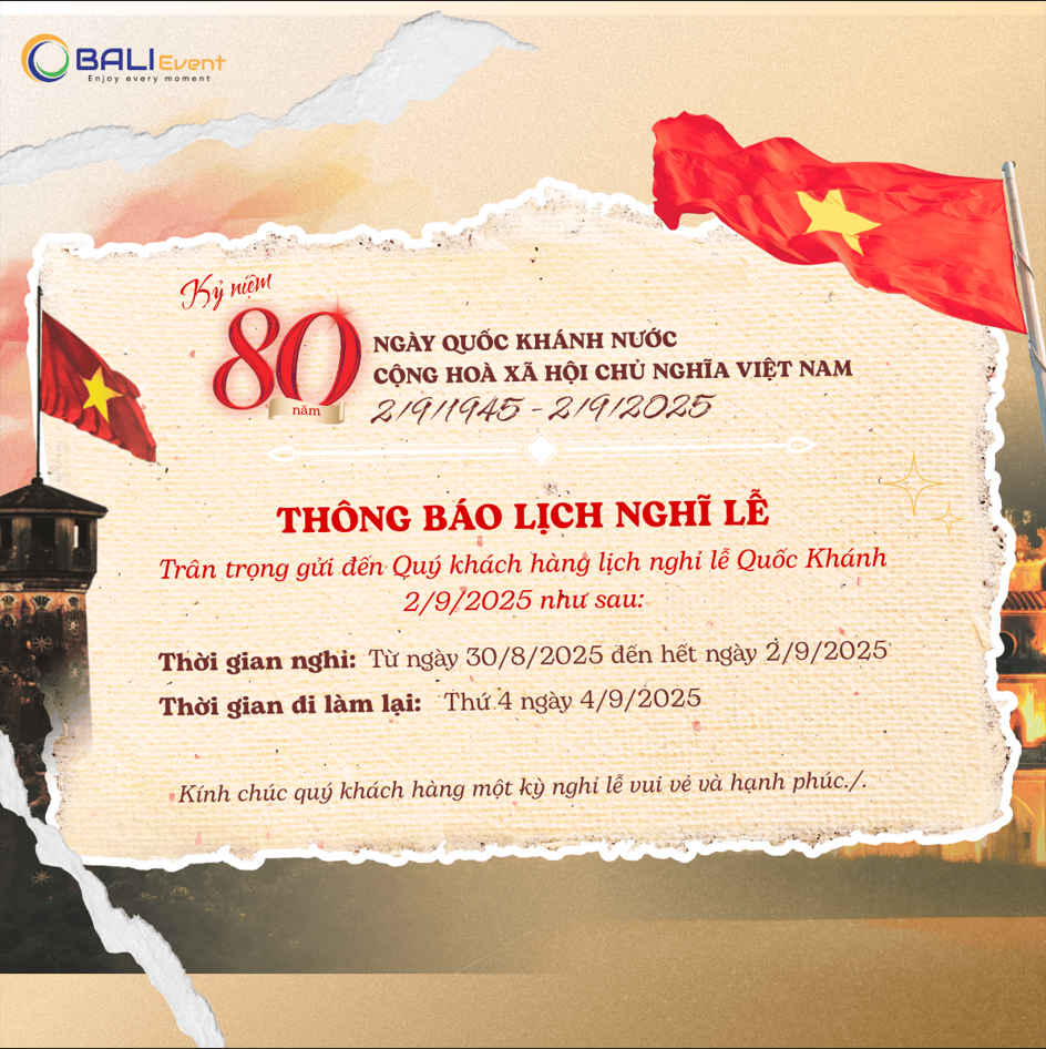 Nhân dịp Lễ Quốc khánh 2/9, kỷ niệm 80 năm Cách mạng Tháng Tám thành công và Quốc khánh Nước Cộng hòa Xã hội Chủ nghĩa Việt Nam (1945 - 2025), Bali Event xin trân trọng thông báo lịch nghỉ lễ như sau: